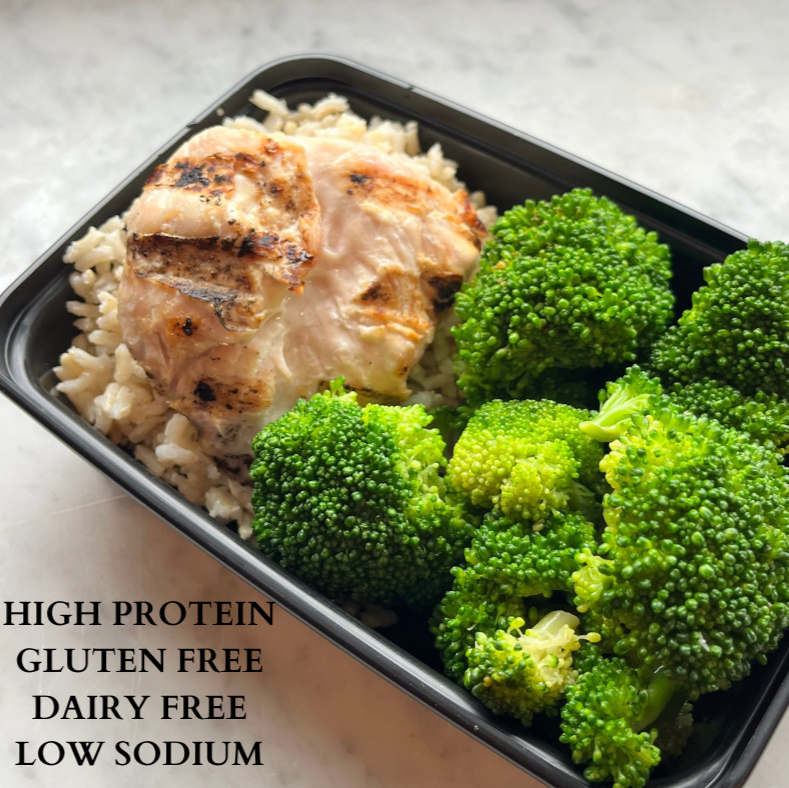 baked organic chicken breast with organic broccoli and brown rice. (No seasoning or oils are used in the making of this dish)