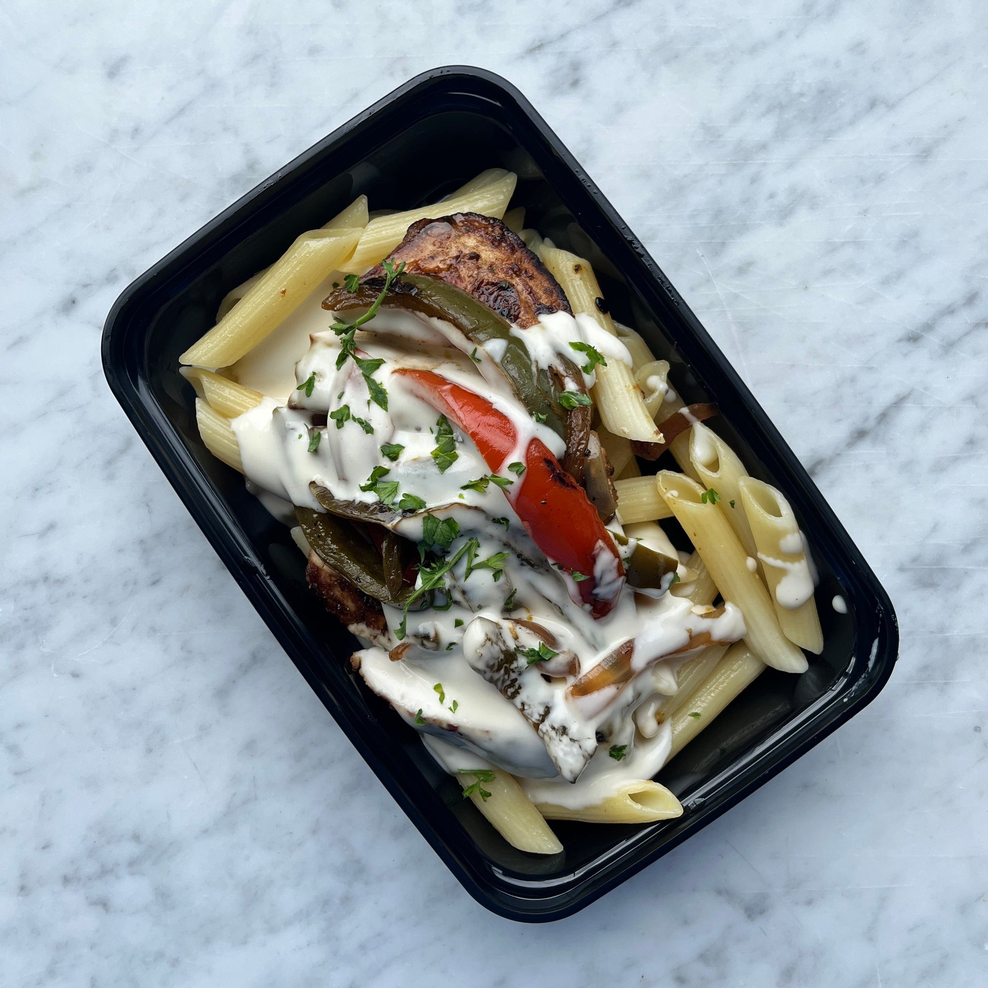 This dish features organic chicken breast marinated in traditional Jamaican jerk seasoning, paired with slices of peppers and onions, and served over a bed of creamy Alfredo penne pasta.