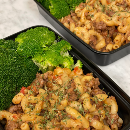 This hearty pasta dish is filled with flavorful ground beef, juicy diced peppers, and served with a side of fresh broccoli.