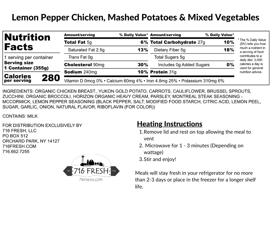 Experience the delicious flavors of our Organic Lemon Pepper Chicken, served with a side of creamy Mashed Russet Potatoes and a colorful assortment of Mixed Seasonal Vegetables. All of our ingredients are organic, ensuring a high-quality and healthy meal for you and your family.